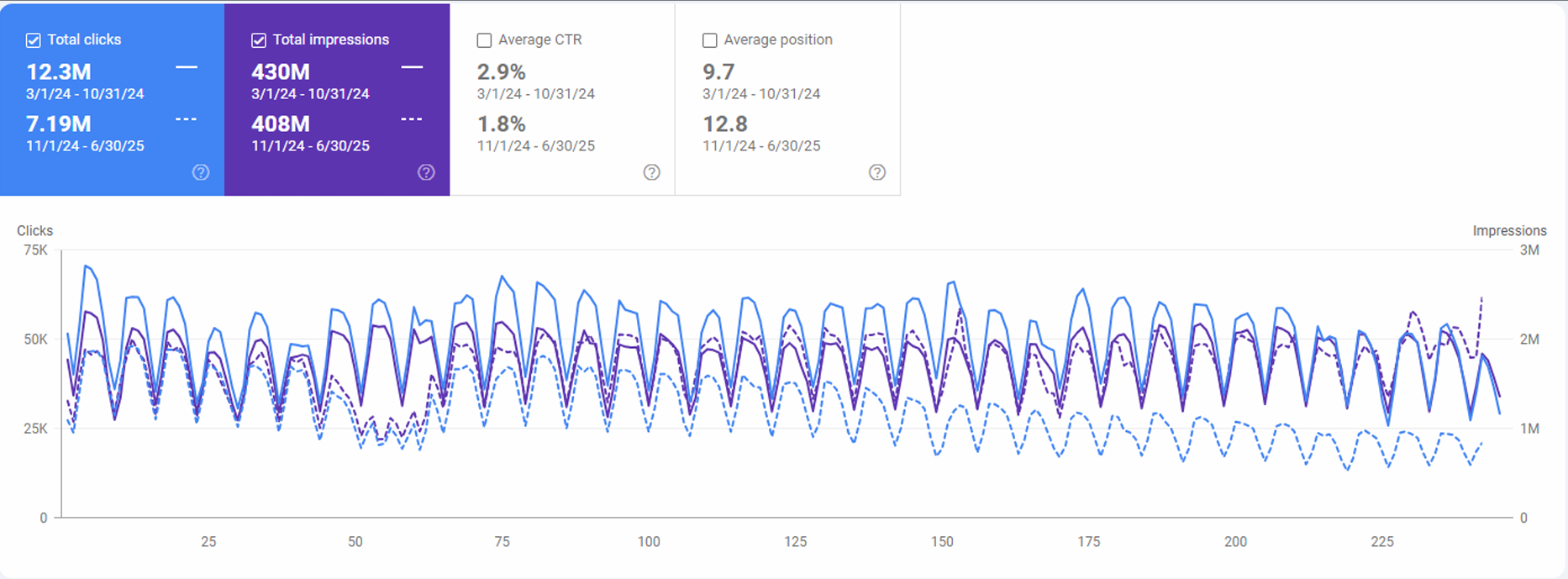 Over 16 months of analysis (March 2024 – June 2025), the site accumulated 19.4M total clicks and 840M impressions from organic search—demonstrating enormous scale and equally enormous optimization opportunity.